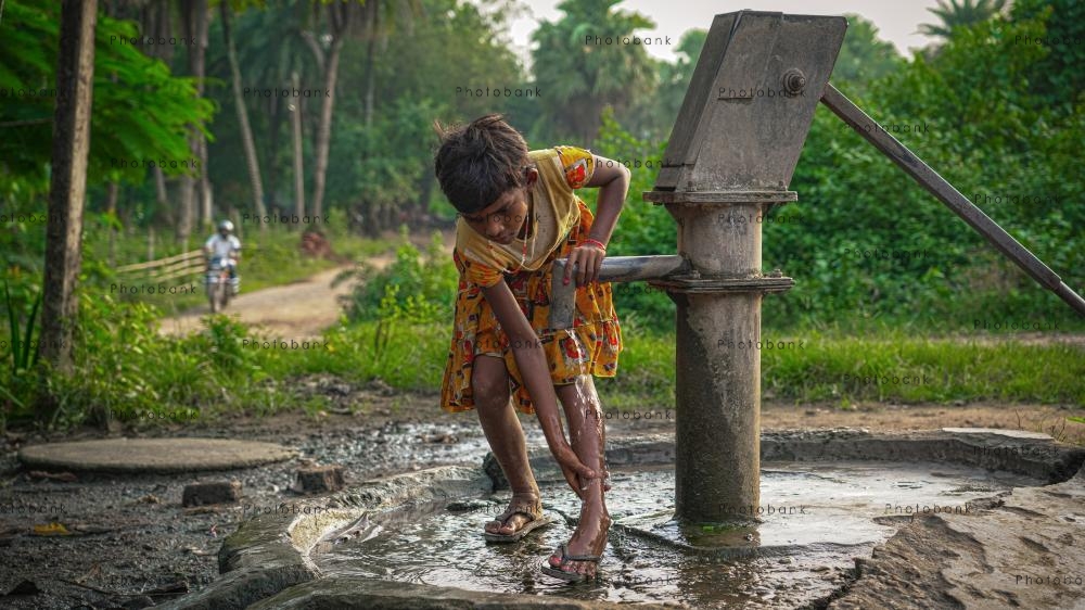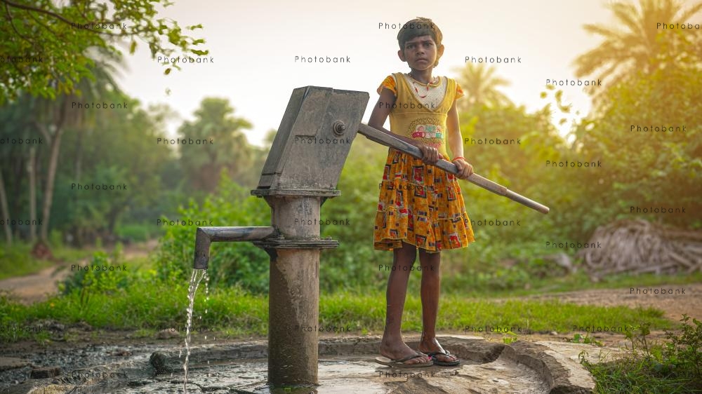 Rural Girl Using Hand Pump for Water